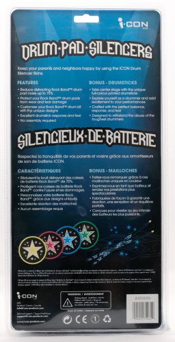 DescriptionKeep your parents and neighbours happy by using the i-CON by ASD Drum Pad Silencers. These innovative drum pads reduce distracting Rock Band drum pad noise up to 75% and at the same time, protect your Rock Band drum kit from wear and tear. Customize your Rock Band drum kit with the unique designs. No assembly required. BONUS DRUMSTICKS INCLUDED. Take center stage with the unique full-colour printed drumsticks. Express yourself as a drummer and add excitement to your performances. Crafted with the perfect balance, response, and feel and designed to withstand the abuse of the toughest drummers.Features
